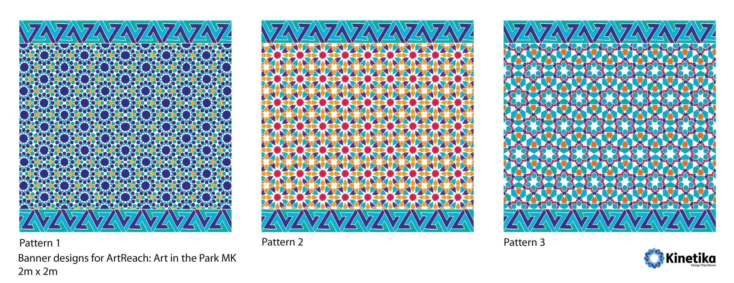 In June 2014, Kinetika Design Studio were commissioned by Milton Keynes Islamic Arts and Culture Organisation to design and produce 6 hand painted flags as site décor for their Art in the Park Festival. The flag designs were inspired by Islamic geometric patterns and colours that Mark worked with Ali Pretty closely on to produce.